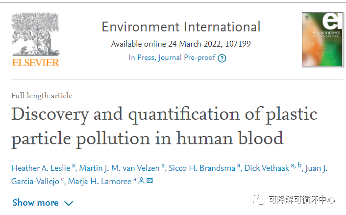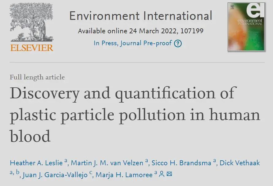 According to the Guardian report,Dutch scientists analyzed blood samples from 22 anonymous donors. Quantifiable micro-plastics were detected in the blood of 17 people(77%), with an average concentration of micro-plastics particles in the blood as high as 1.6 micro-grams per milliliter. The most common plastics are polyethylene terephthalate(PET),polystyrene(PS), polyethylene(PE),polypropylene(PP) and polymethyl methacrylate(PMMA). It is believed to be the first time micro-plastics have been found in human blood. The study was published in Environment International (IF=9.621), the top journal in the field of environmental science, in the early morning of March 25th, Beijing time.