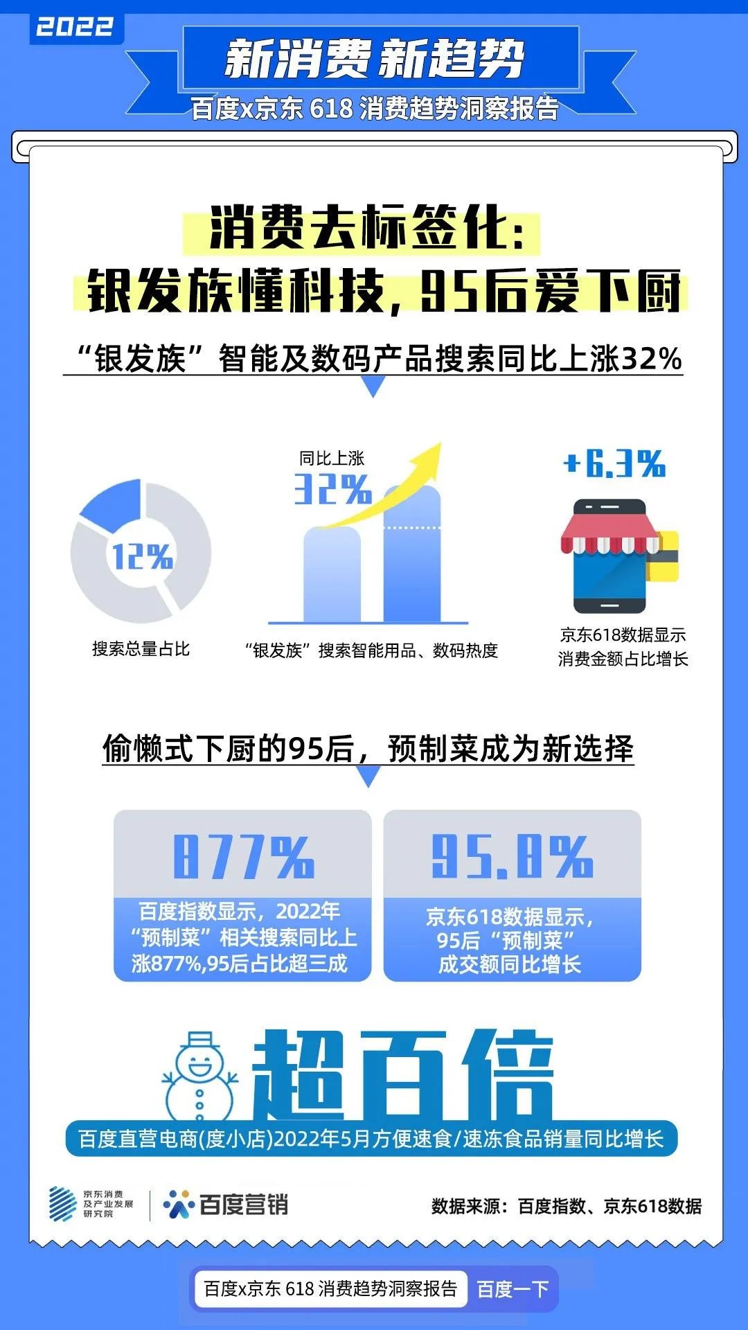 During June 18, Baidu and JD.com jointly released “Baidu X JD.com 618 Consumer Trend Insight Report”. According to the report, the "lazy" cooking generation born after 1995 has led to a boom in prefabricated food. Baidu Index shows that searches related to "prefabricated food" in 2022 will increase by 877% year-on-year.